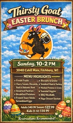 Join Thirsty Goat on Sunday, April 5th, for Easter Brunch! Enjoy fresh fruits, assorted pastries, biscuits and gravy, smoked ham and turkey, and even more delicious brunch staples.